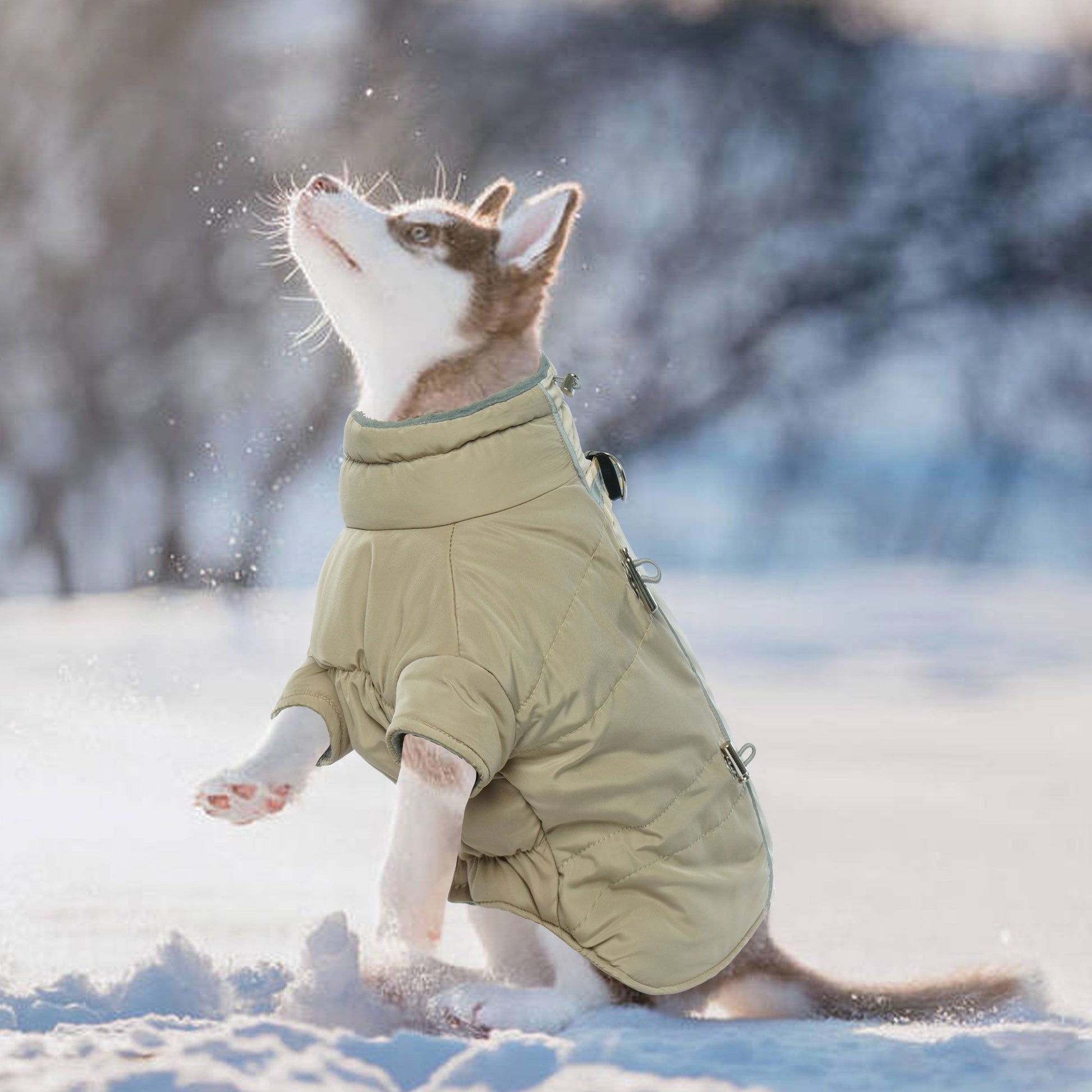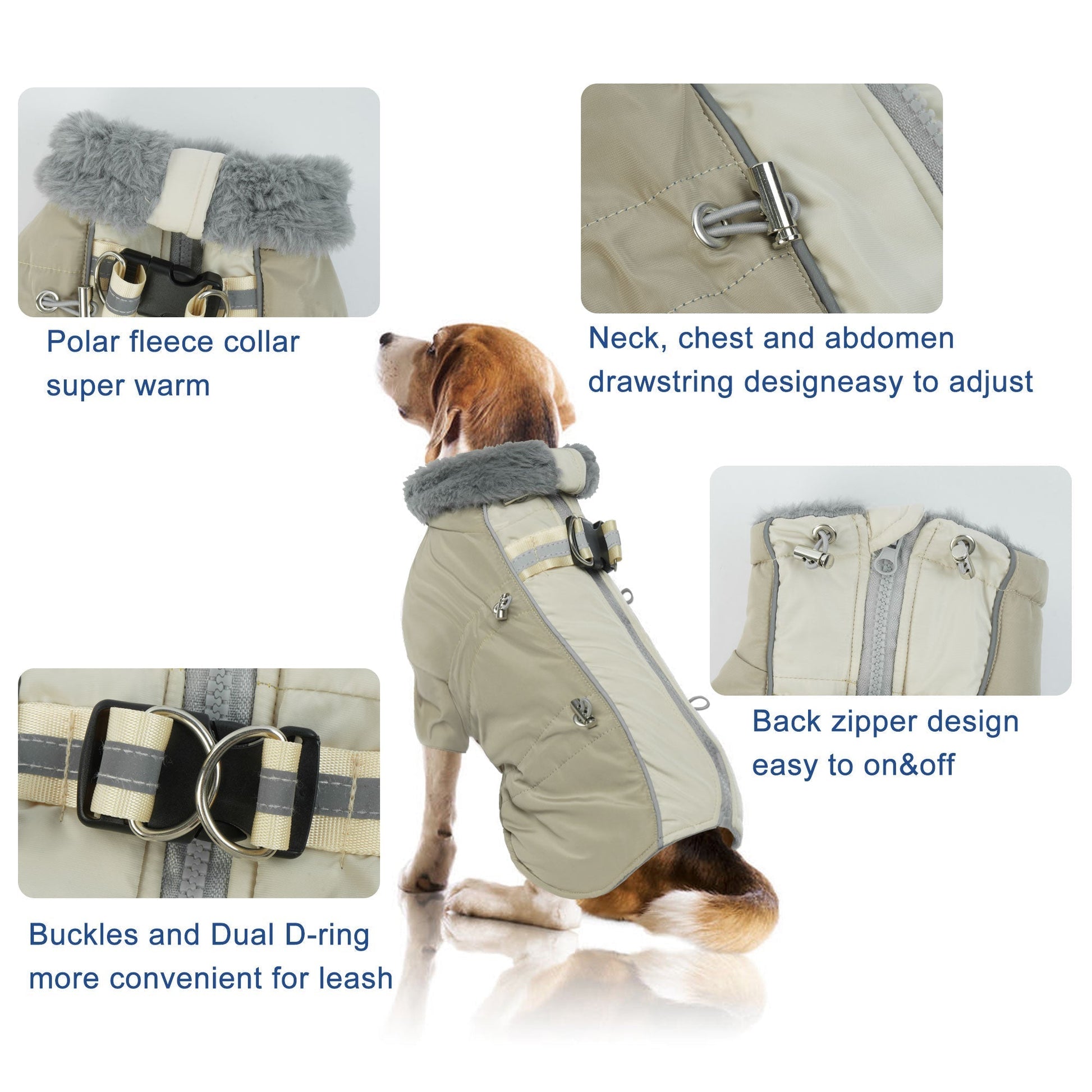 This dog cold weather coats have reinforced d-rings on the back. which can withstand strong pulling force. more convenient. Highlight reflective strips can keep you and your dog safe when outing at night.