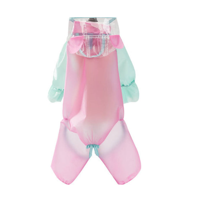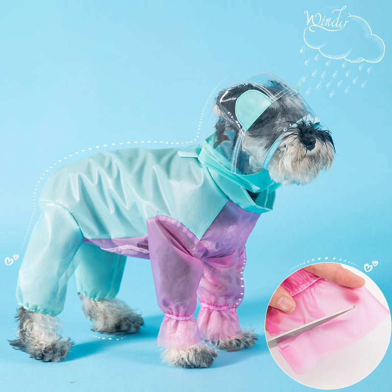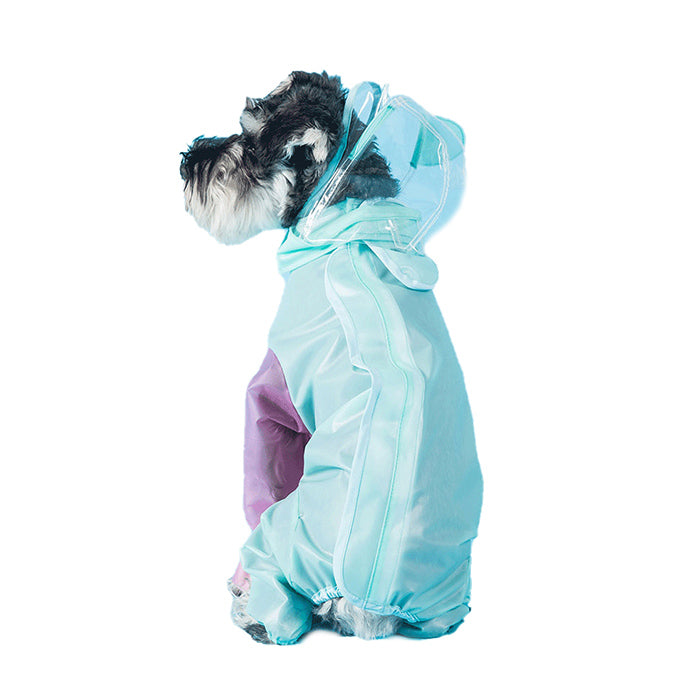 - The polyester blended outer shell is completely waterproof and designed to protect his entire body in the rainning day with fastener straps on each leg and a hood that can be drawn over his face.