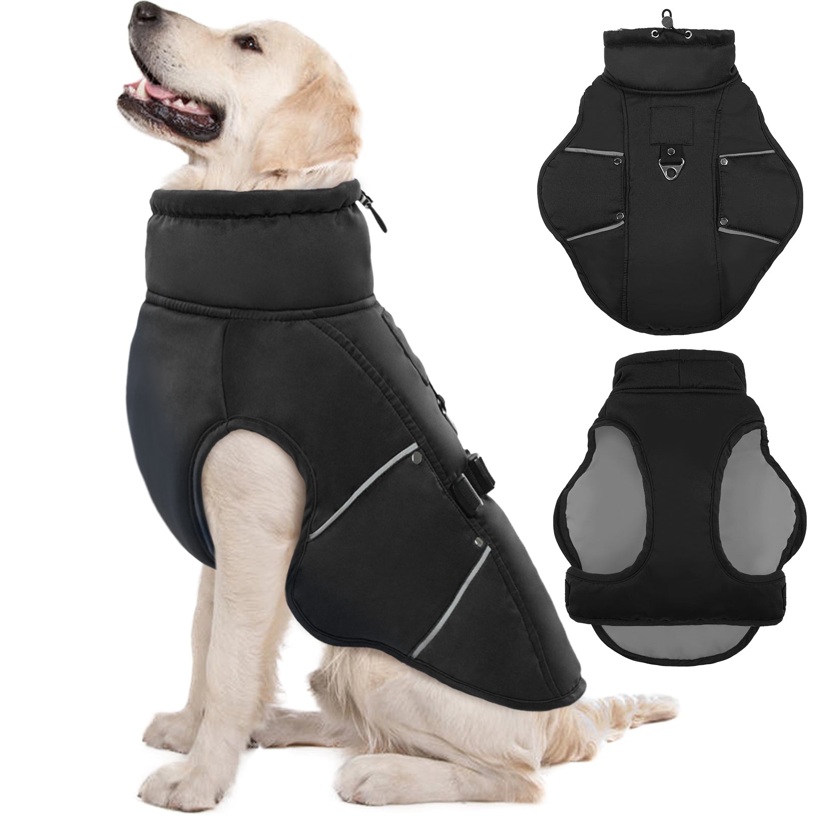 The windproof dog jacket features reflective decorative stitching. in addition. this dog jacket comes with a sturdy metal D-ring on the back. allowing you to easily tie the dog's leash