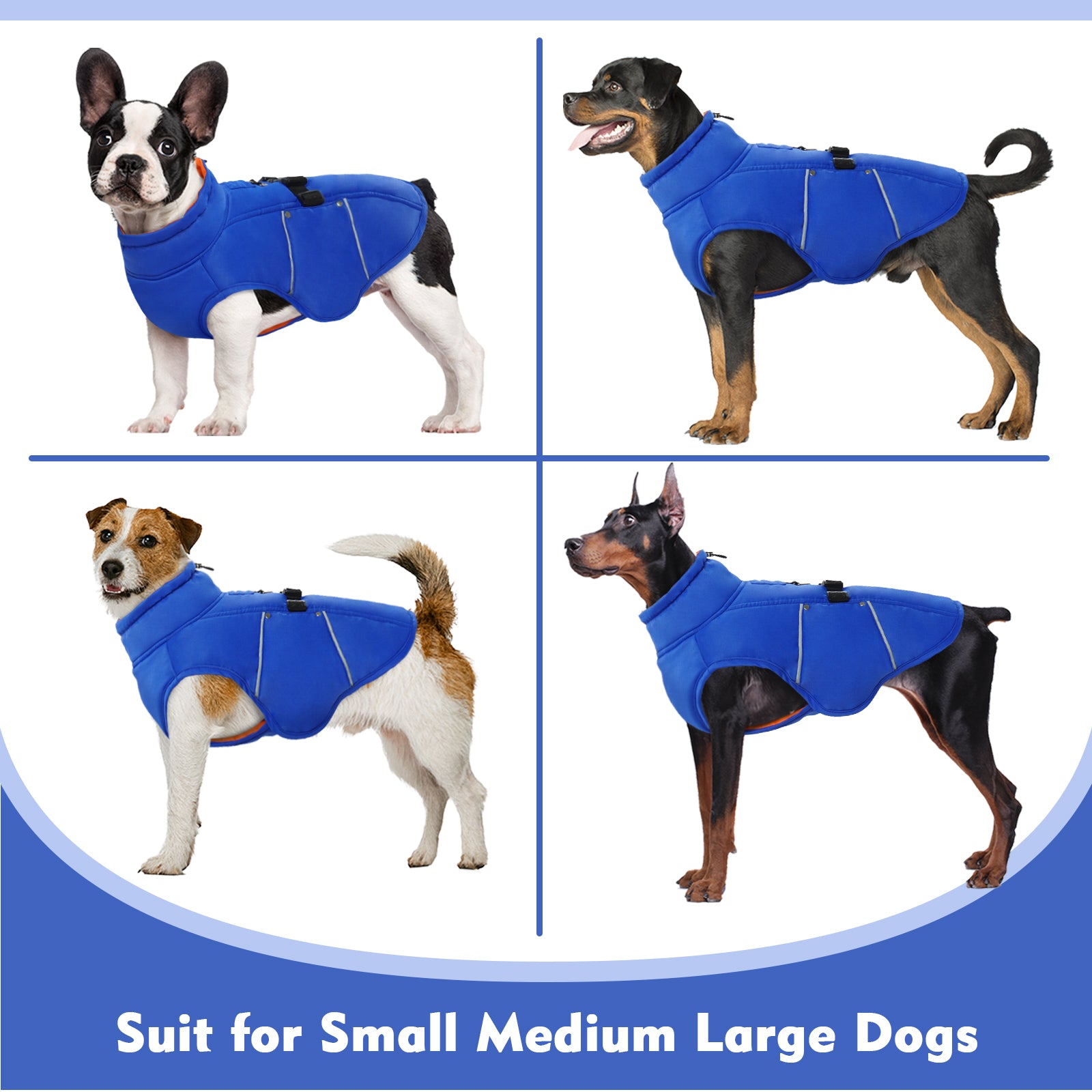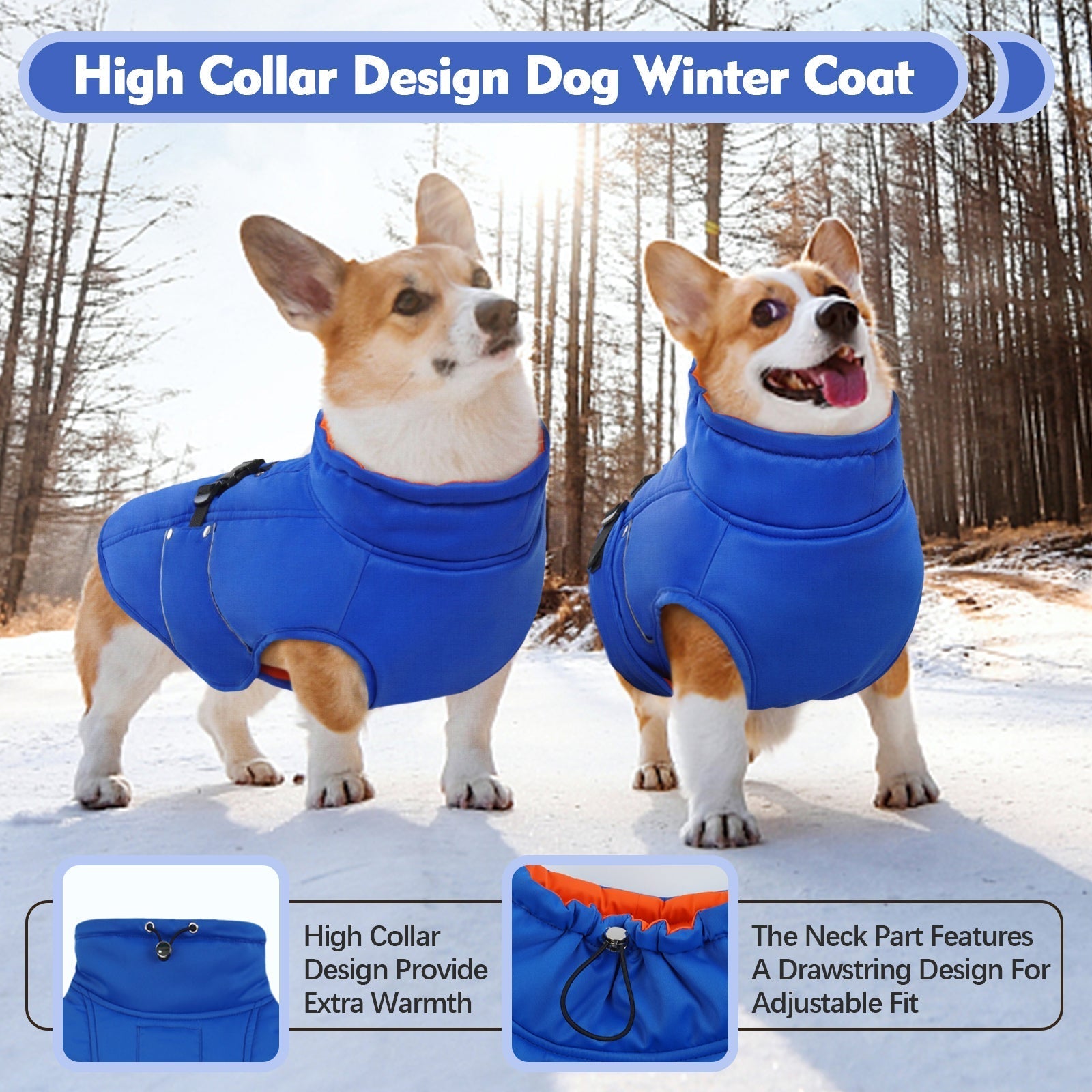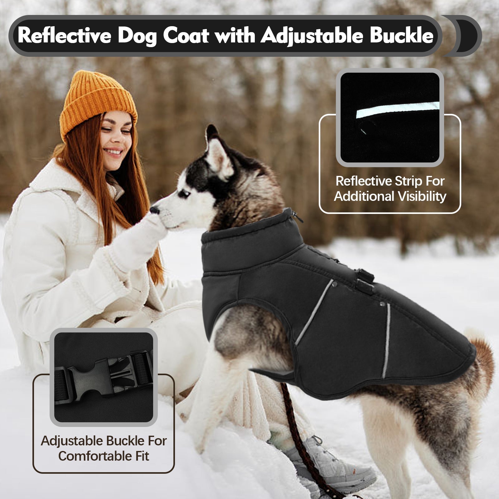 The dog winter jacket features a high collar design and an adjustable elastic buckle. This thoughtful design provides excellent protection for your pet's neck. head. and ears from the effects of rain. snow. wind. and low temperatures.