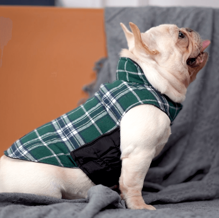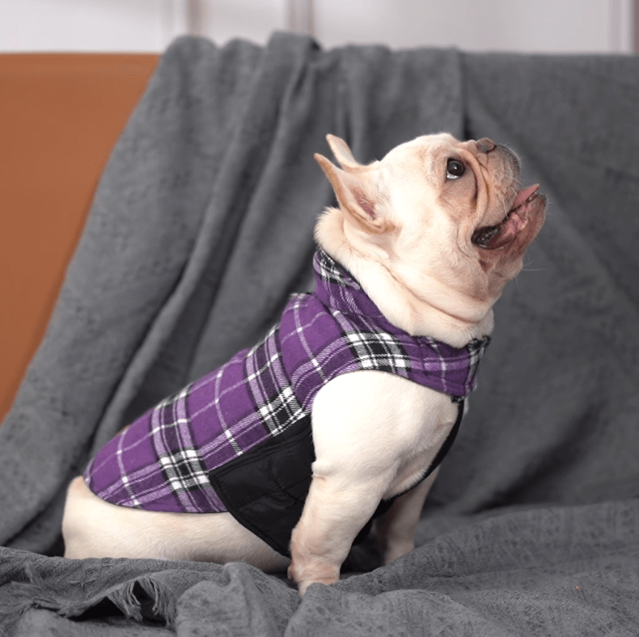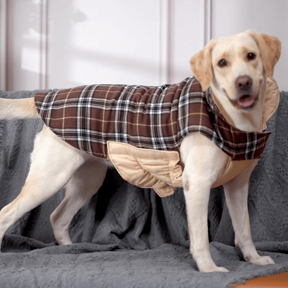 This reversible dog winter coat is made of quilted waterproof polyester fiber on one side.