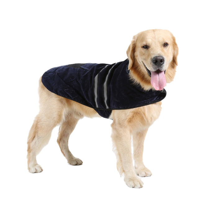 The thick fluffy fabric provides heat preservation for the dog's skin and prevents rain and wind from entering. There are two reflective strips on the back so that the dog can be easily spotted in a low-light environment. which ensures the dog's safety. There are wide Velcro tapes on the neck and abdomen for easy putting on and taking off. In addition. there is a pocket design on the back. which can store dog snacks and poop belts.